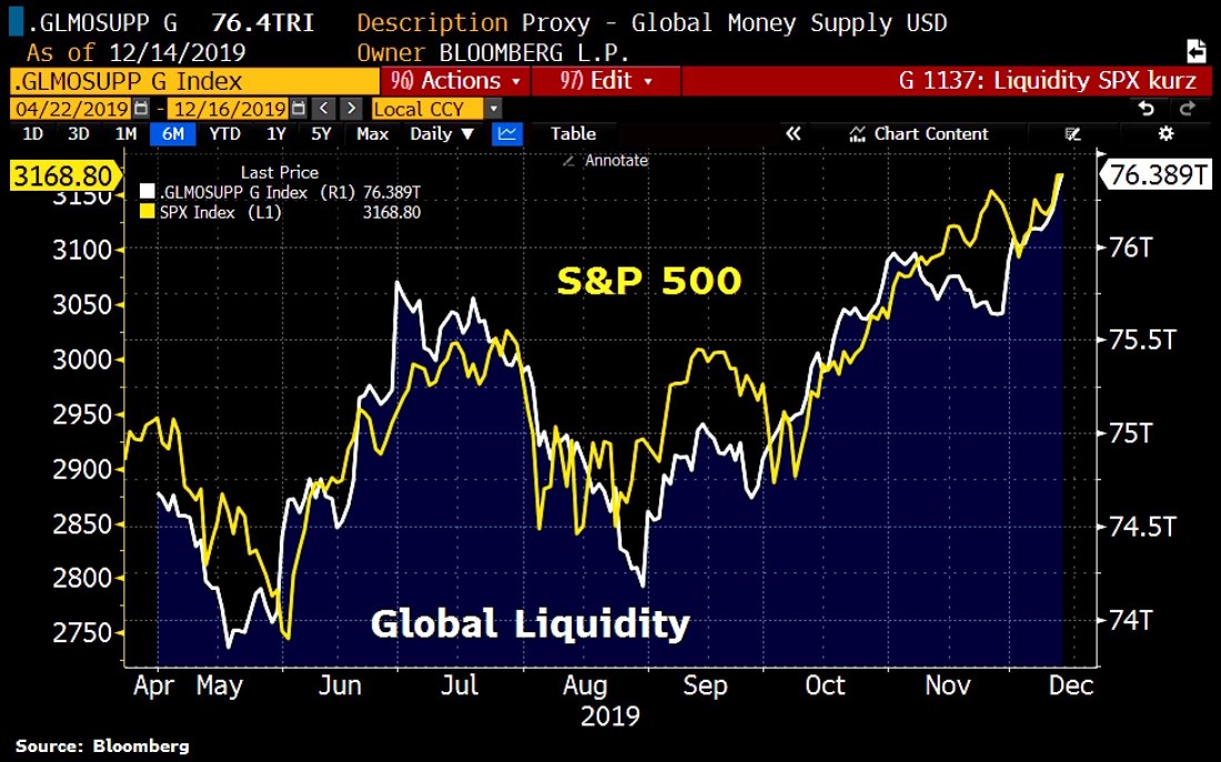 The correlation between the balance sheet and the stock market is clear, here expressed in terms of global #liquidity superimposed to the #S&P500.
