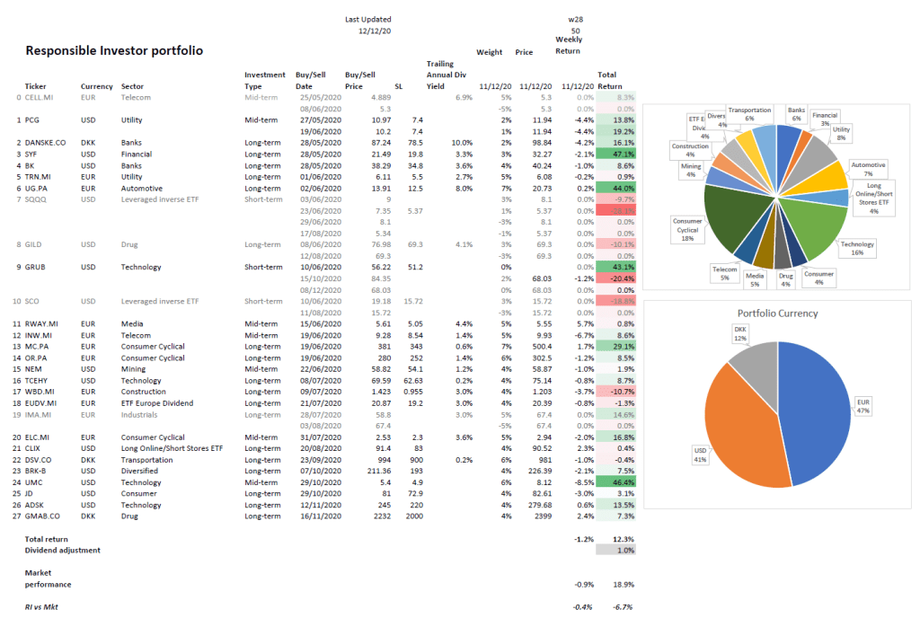 Our Responsible Investor portfolio is now up 20.6% (21.5% including dividends) in 9 months. We are about 60% in stocks & ETFs and 40% in cash. On my watchlist this week I have $DVA, $CMG, $VIAV, $MSFT, $AMBU-B.CO and $OCDO.L.