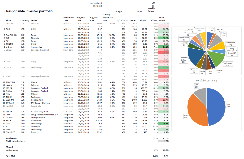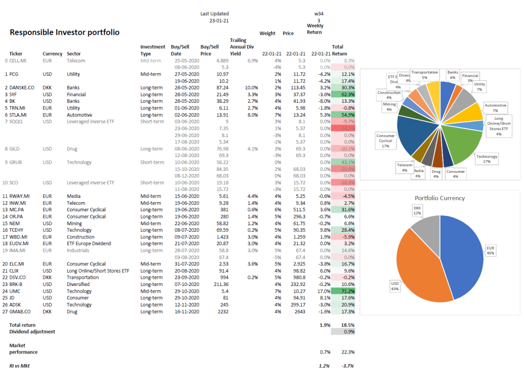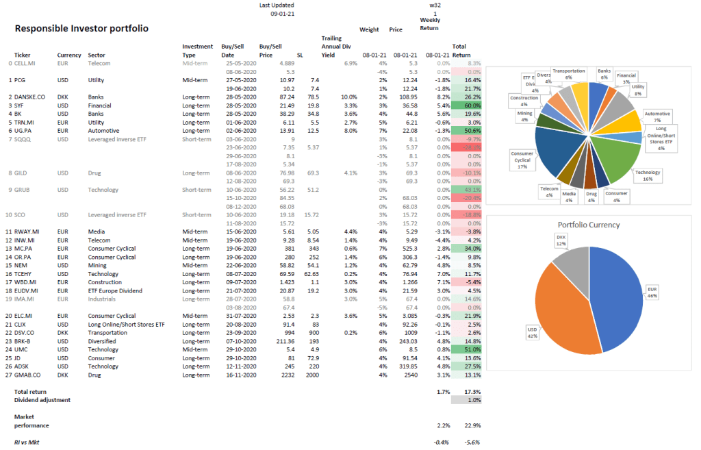 Our Responsible Investor portfolio is now up 18.5% (19.4% including dividends) in 34 weeks. We are about 59% in stocks & ETFs and 41% in cash. On my watchlist this week I have $DVA, $CMG, $VIAV, $TRYG.CO and $OCDO.L.