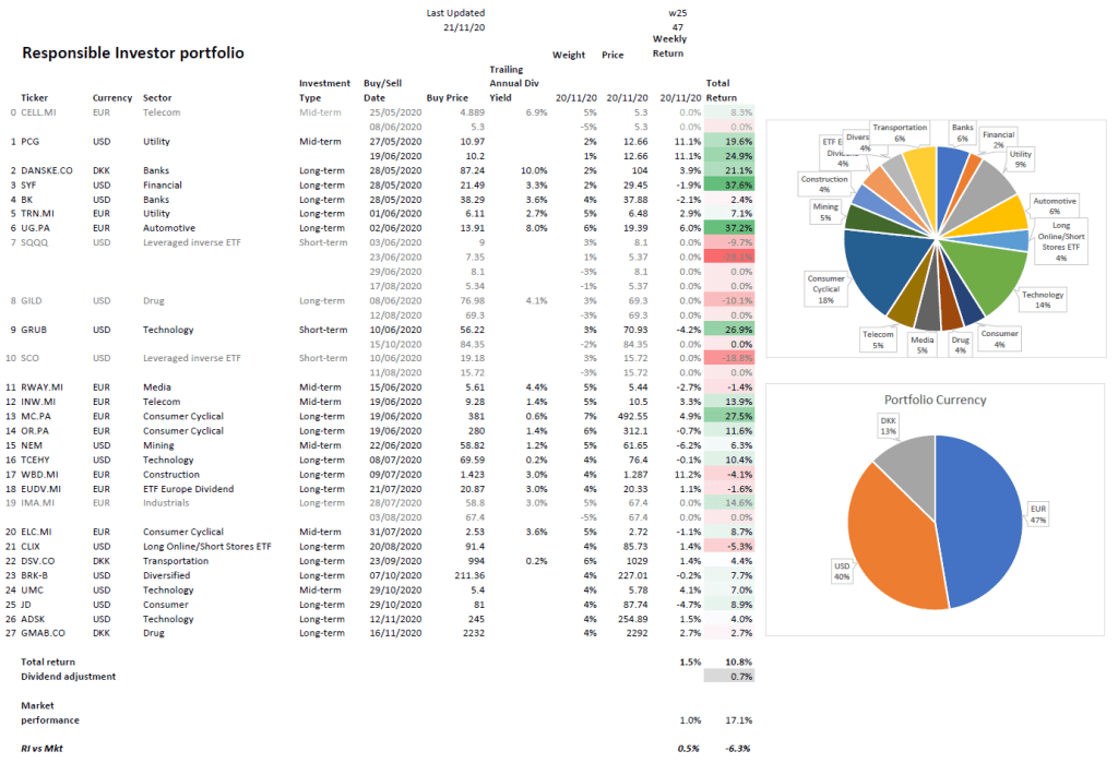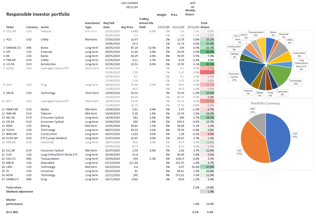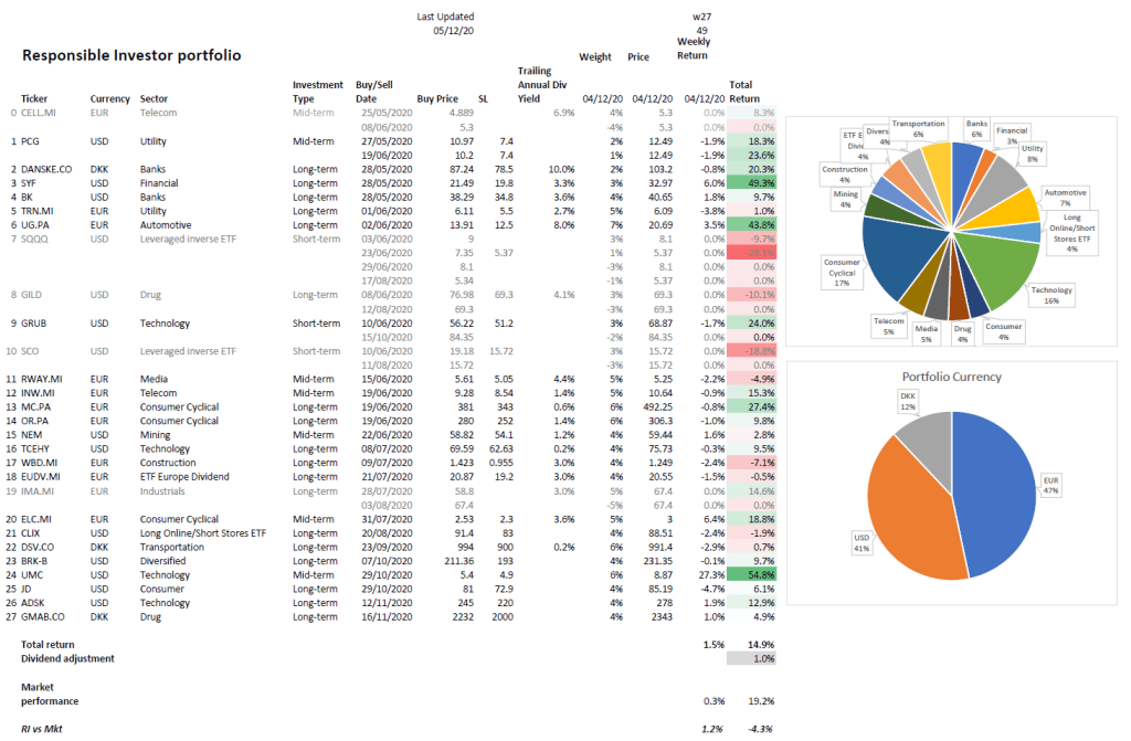 Our Responsible Investor portfolio is now up 18.5% (19.4% including dividends) in 34 weeks. We are about 59% in stocks & ETFs and 41% in cash. On my watchlist this week I have $DVA, $CMG, $VIAV, $TRYG.CO and $OCDO.L.