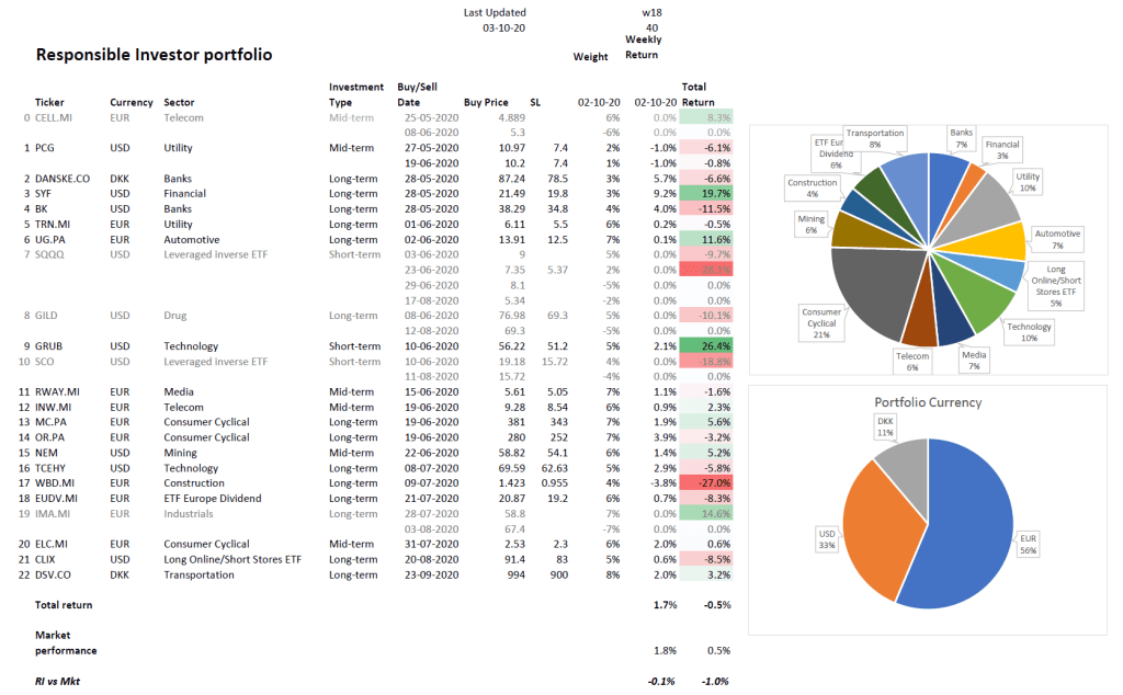 September is finally over and has seen the global markets go lower despite the uptrend in the last trading days of the month. Our Responsible Investor portfolio has beaten the market over this period by 0.9%. In mid to long term investing this is crucial because compounding is amplified relative to the market average performance. When friends ask me how to invest 10k € I suggest that they buy a US market index ETF because that´s too small a sum to diversify your portfolio with a group of stocks with which you can aspire to beat the market. Starting from 30 to 40k €, however, one can have about 25 to 35 different stocks, ETF or bond positions and it makes more sense to pick a diversified group of superior stocks rather than accepting the market average return.