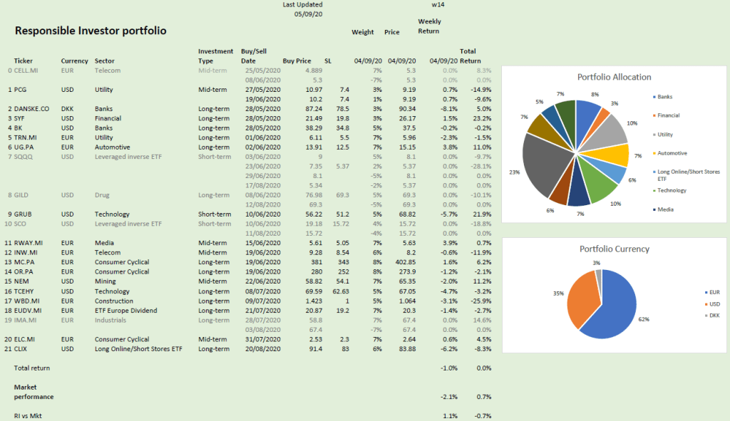 Our portfolio was down this week, but not as much as the market. This is thanks to tech stocks like $GRUB, utility company $PCG and our latest purchase $DSV.CO, all up 3+%. $NEM was hit because of the sharp decline in the price of Gold. Both our banks stocks were affected by the weekly downturn. Overall, though, it is good to see our RI portfolio having beaten the market this week.